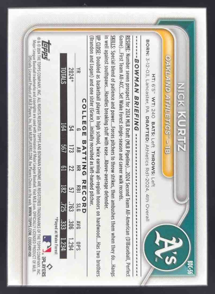 2024 Bowman Draft Chrome #BDC-56 Nick Kurtz RC