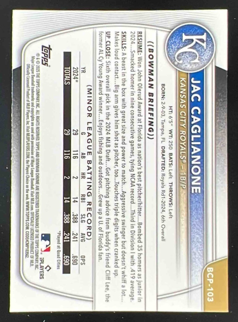 2025 Bowman Chrome Mega Box Burgundy Refractors #BCP-103 Jac Caglianone /275