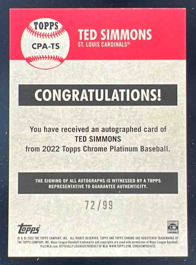 2022 Topps Platinum Anniversary Platinum Toile Cream/Blue Ted Simmons Auto /99