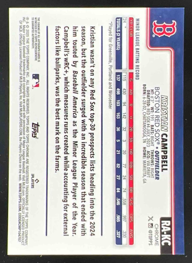 2025 Topps Chrome Rookie Autographs #RA-KC Kristian Campbell RC Auto