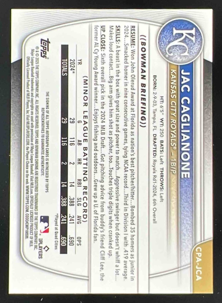 2025 Bowman Chrome Prospect Autographs #CPA-JCA Jac Caglianone Auto