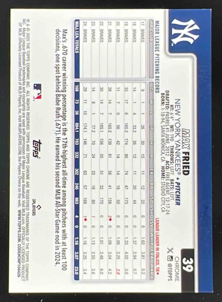 2025 Topps Chrome LogoFractor Red Refractor #39 Max Fried /5