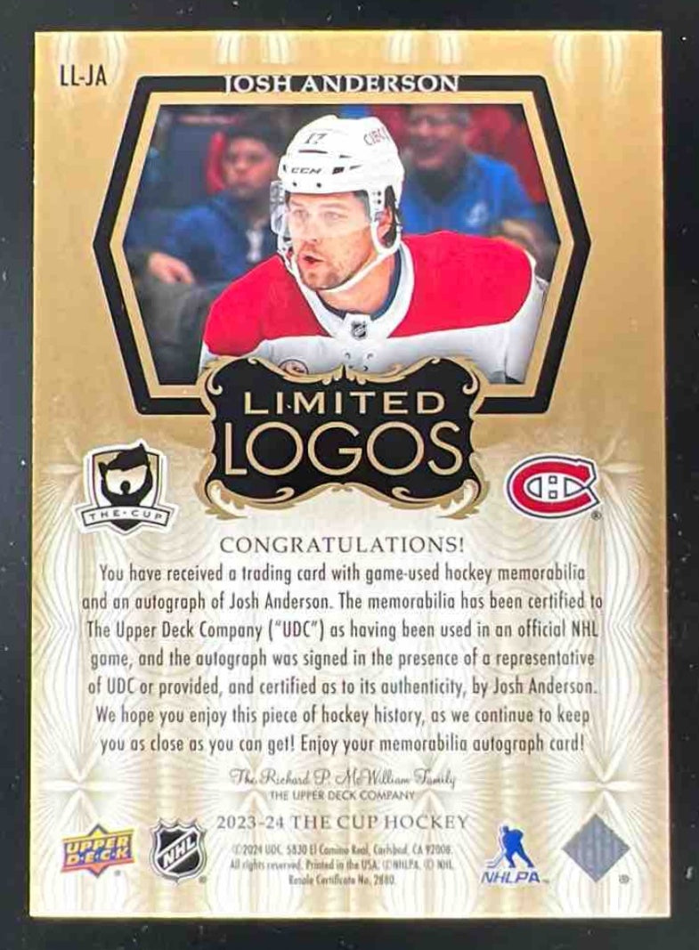 2023-24 The Cup Limited Logos #LL-JA Josh Anderson Autograph Auto /50