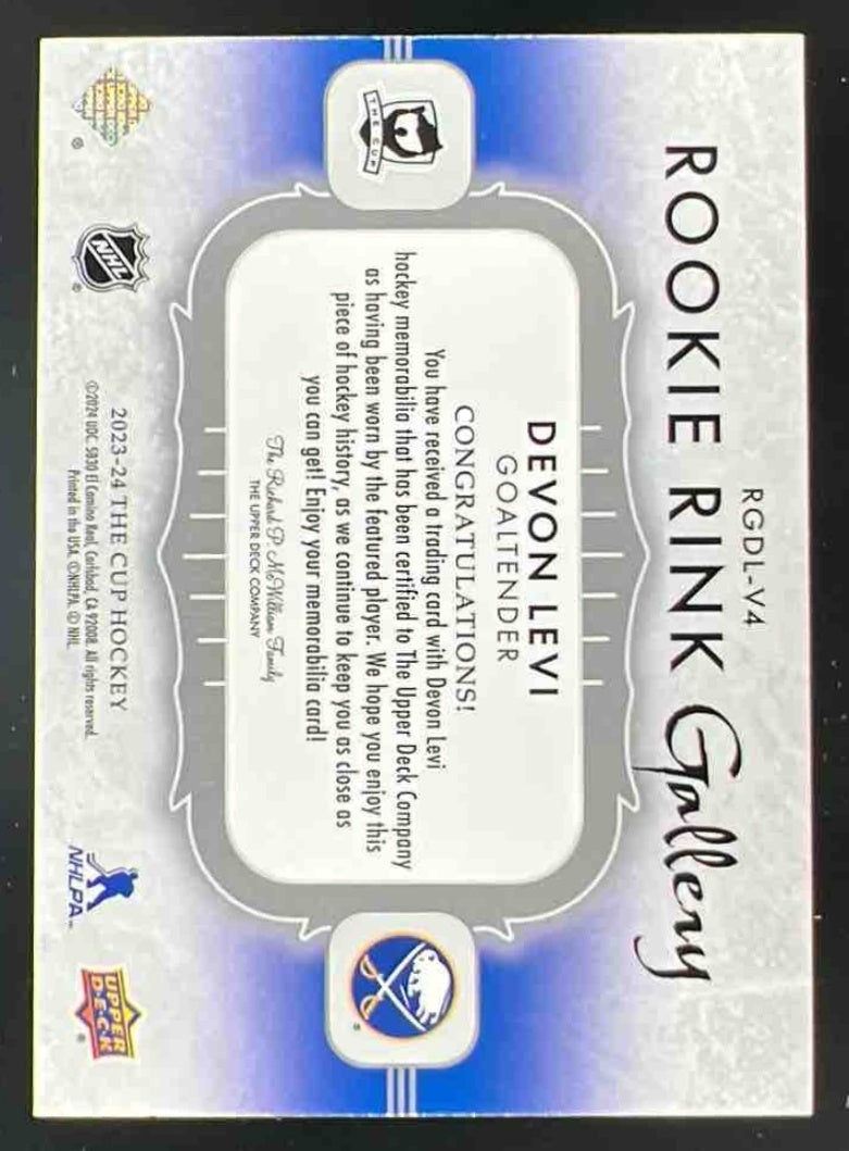 2023-24 The Cup Rookie Rink Gallery Patch #RGDL-V4 Devon Levi /35
