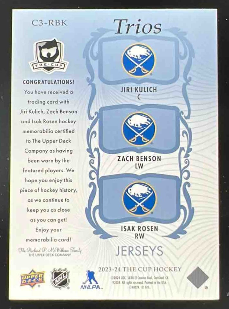 2023-24 The Cup Cup Trios Jersey #C3-RBK Jiri Kulich Zach Benson Isak Rosen /35