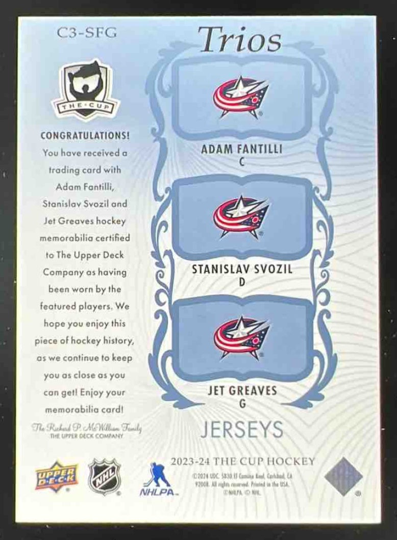 2023-24 The Cup Cup Trios Jersey Adam Fantilli Stanislav Svozil Jet Greaves /35
