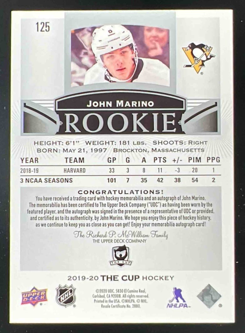 2019-20 Upper Deck The Cup #125 John Marino Rookie Patch Autograph Auto /249