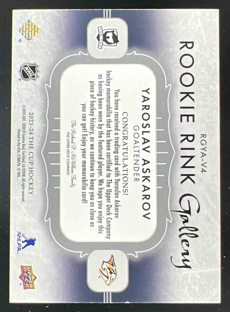 2023-24 The Cup Rookie Rink Gallery Jersey #RGYA-V4 Yaroslav Askarov /49