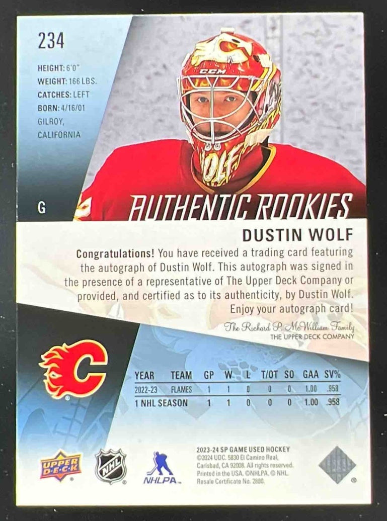 2023-24 Upper Deck SP Game Used Auto #234 Dustin Wolf Autograph RC Auto