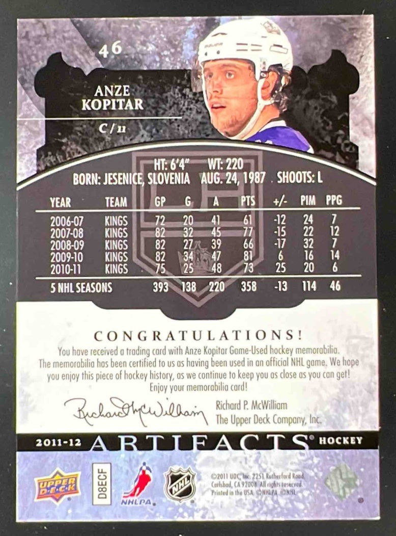 2011-12 Upper Deck Artifacts Jerseys Patch Tags Black #46 Anze Kopitar /5