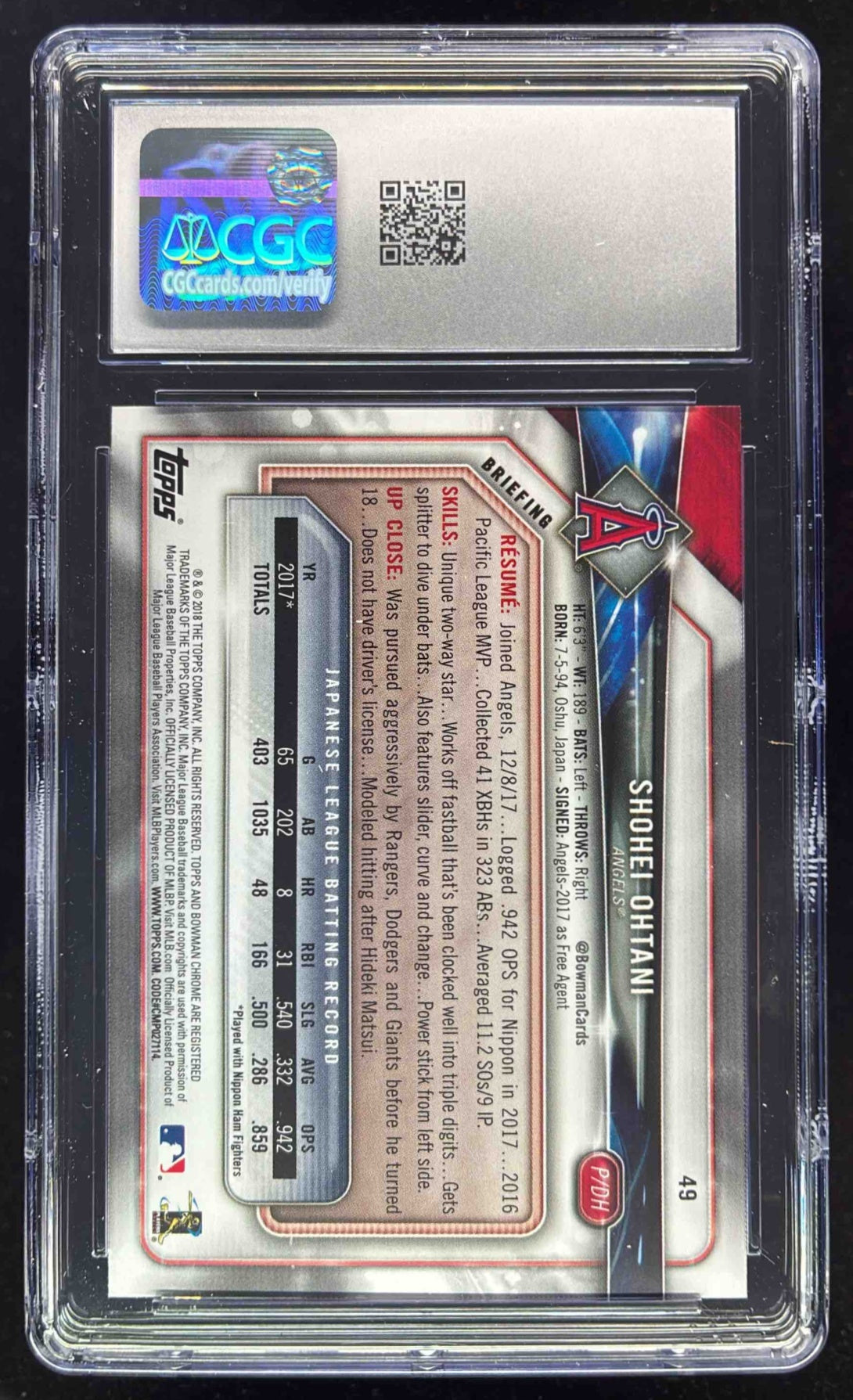 2018 Bowman #49 Shohei Ohtani RC CGC 10