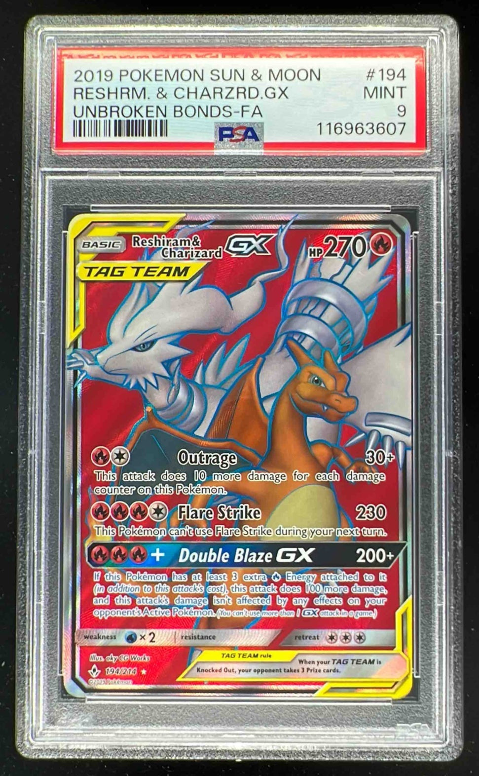 2019 Pokemon Sun & Moon Unbroken Bonds #194 Reshiram & Charizard Tag Team PSA 9