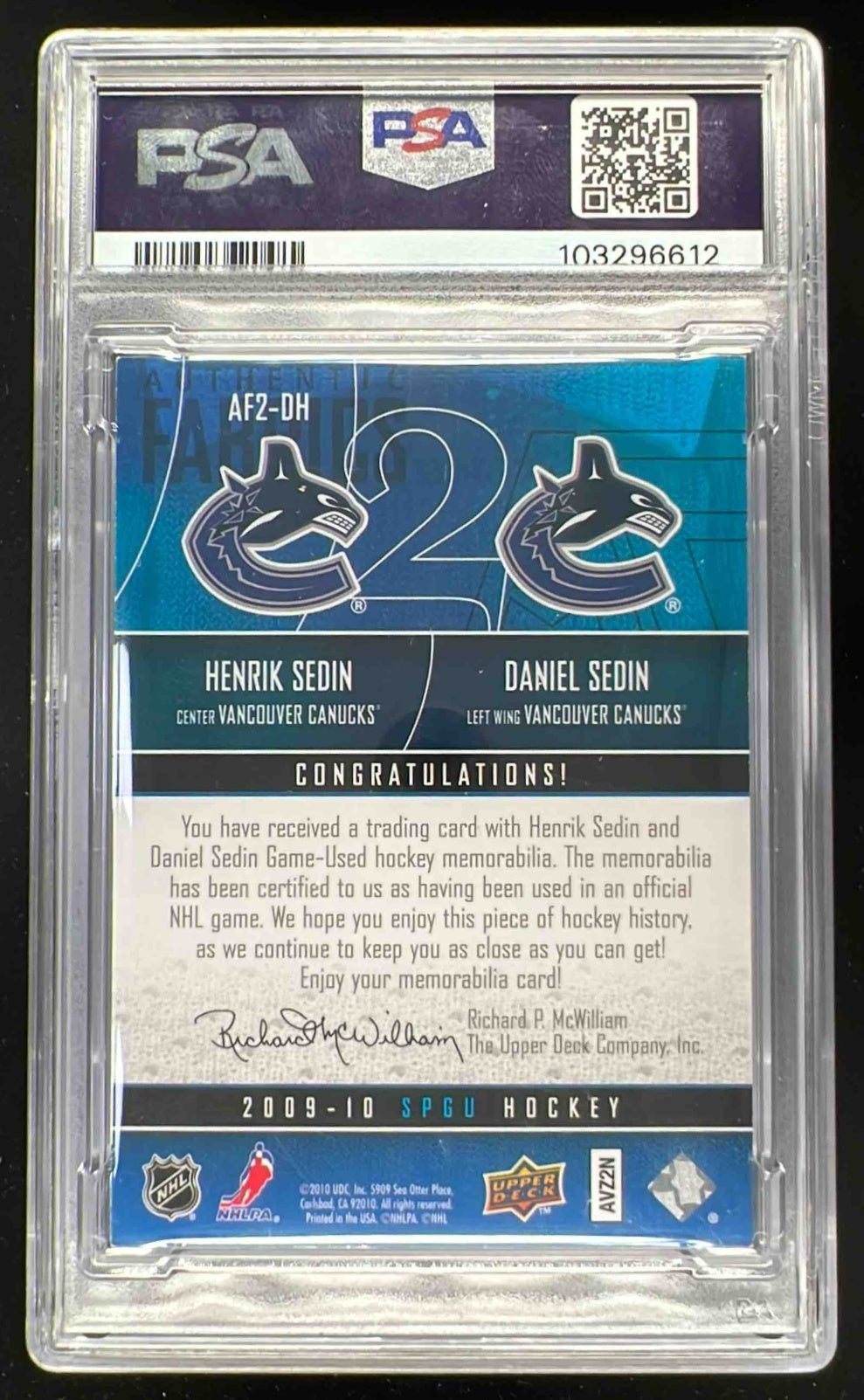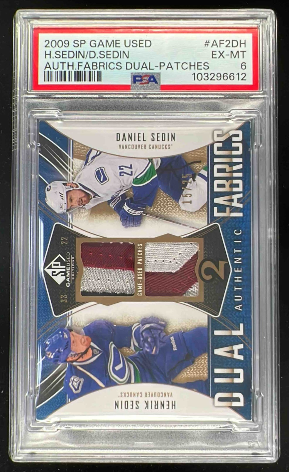 2009 SP Game Used Authentic Fabrics Dual Patches Henrik Daniel Sedin /25 PSA 6