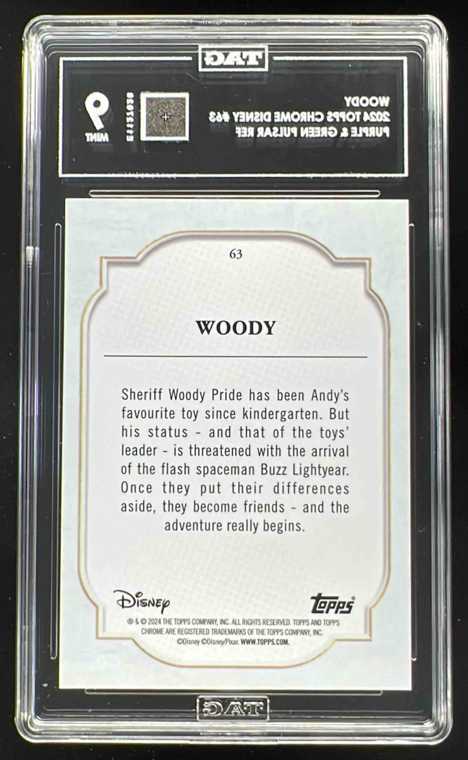 2024 Topps Chrome Disney Purple and Green Pulsar #63 Woody /150 TAG 9