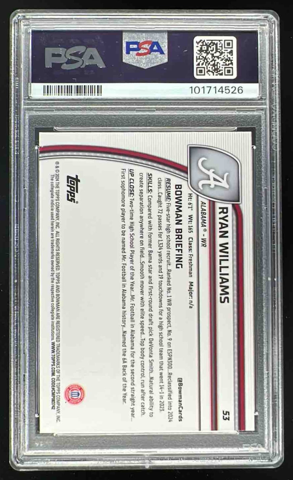 2024 Bowman Chrome University #53 Ryan Williams RC PSA 9