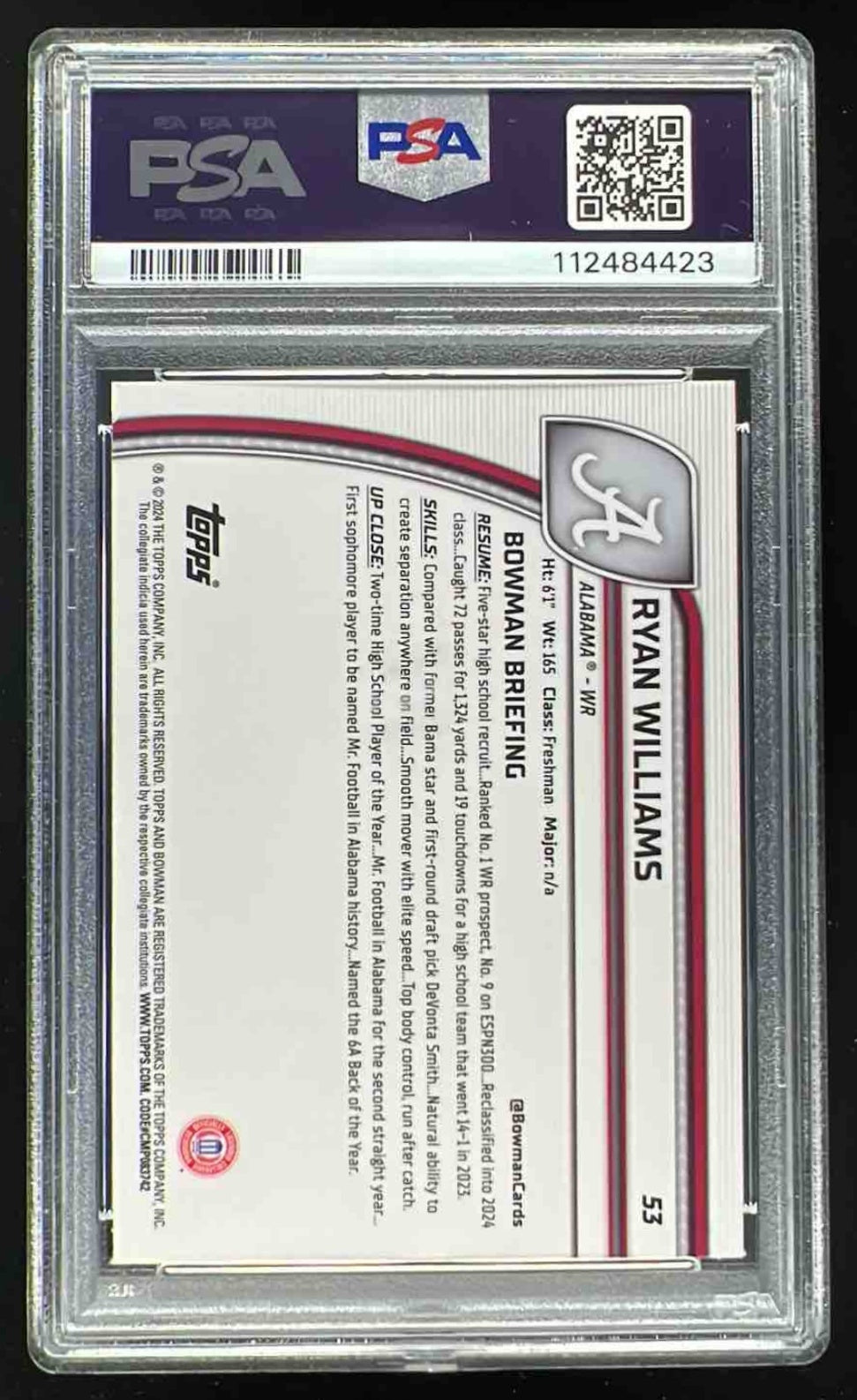 2024 Bowman Chrome University #53 Ryan Williams RC PSA 10