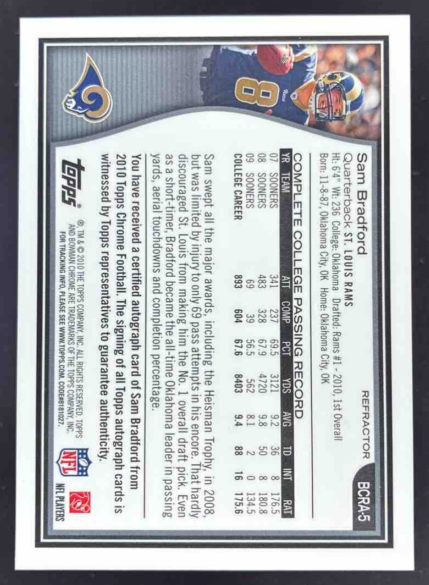 2010 Topps Chrome Bowman Rookies Autographed #BCRA-5 Sam Bradford RC Auto /25