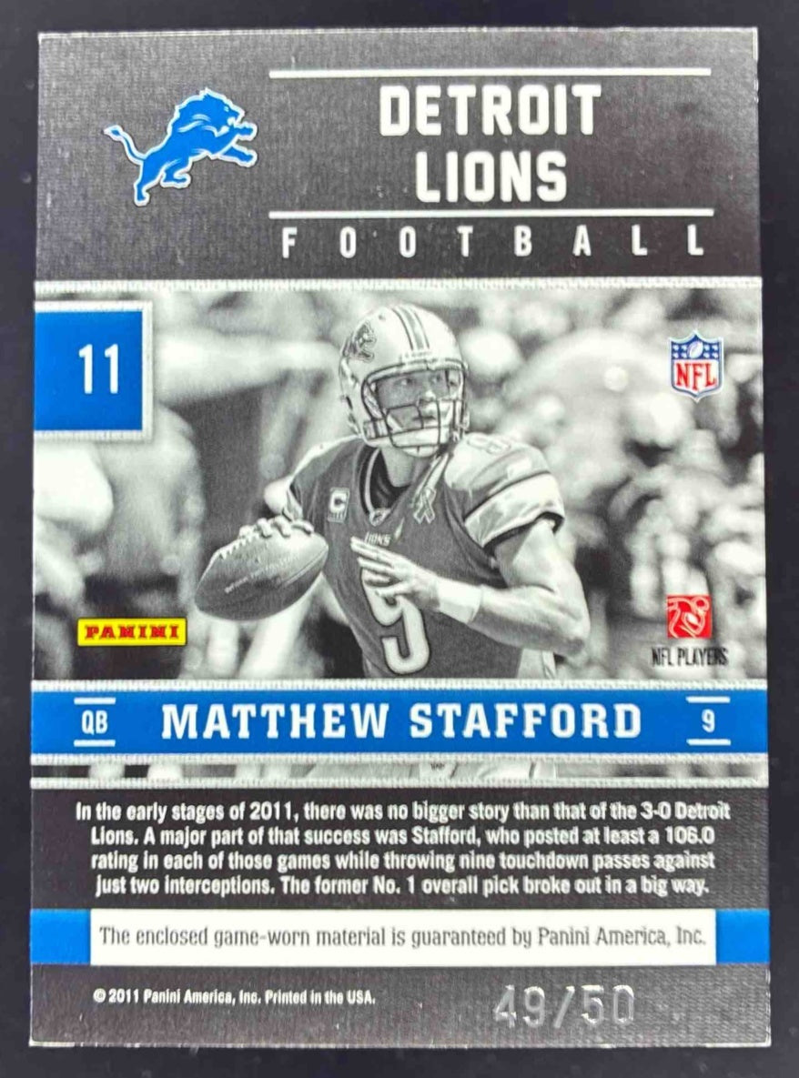 2011 Panini Limited Team Trademarks Materials Prime #11 Matthew Stafford /50