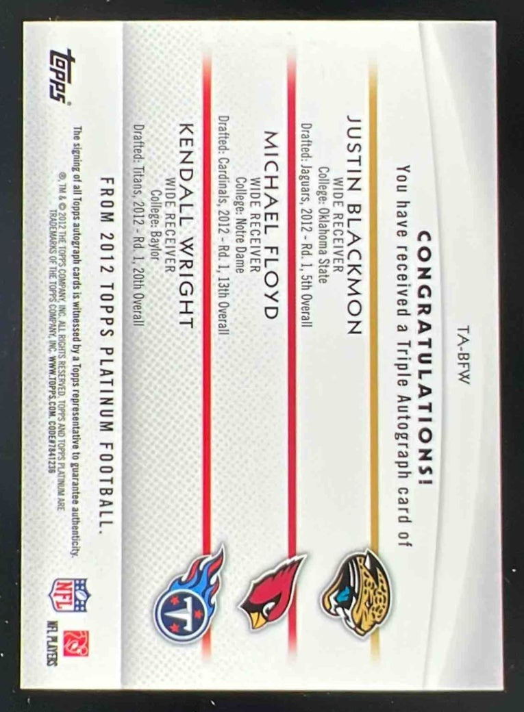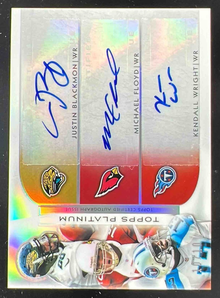 2012 Topps Platinum Auto Triple Justin Blackmon Michael Floyd Kendall Wright /10