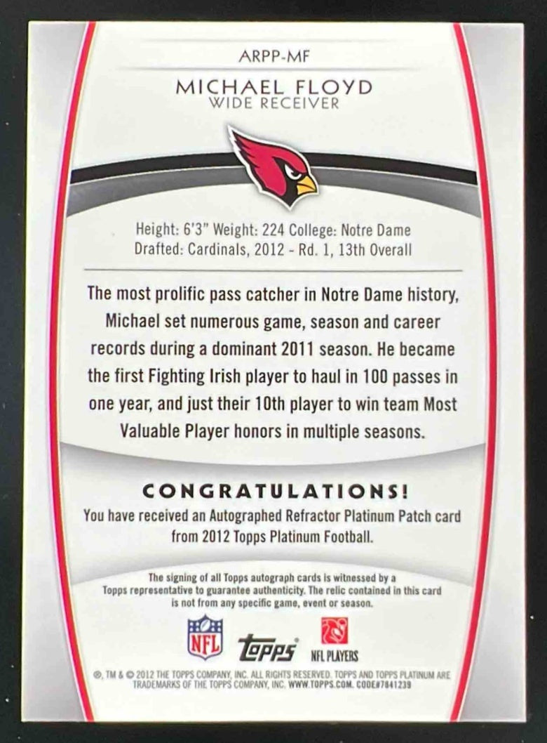 2012 Topps Platinum Autographed Patch Refractors #MF Michael Floyd RC Auto /5