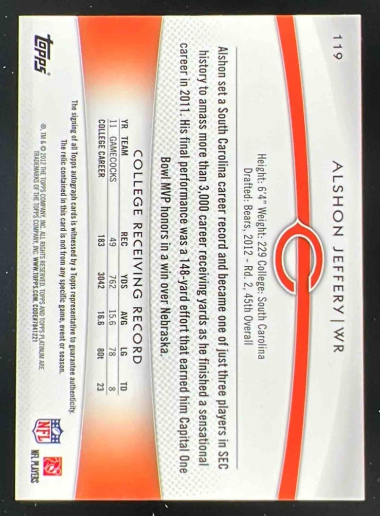 2012 Topps Platinum Rookie Patch Blue Refractors #119 Alshon Jeffery RC Auto /25