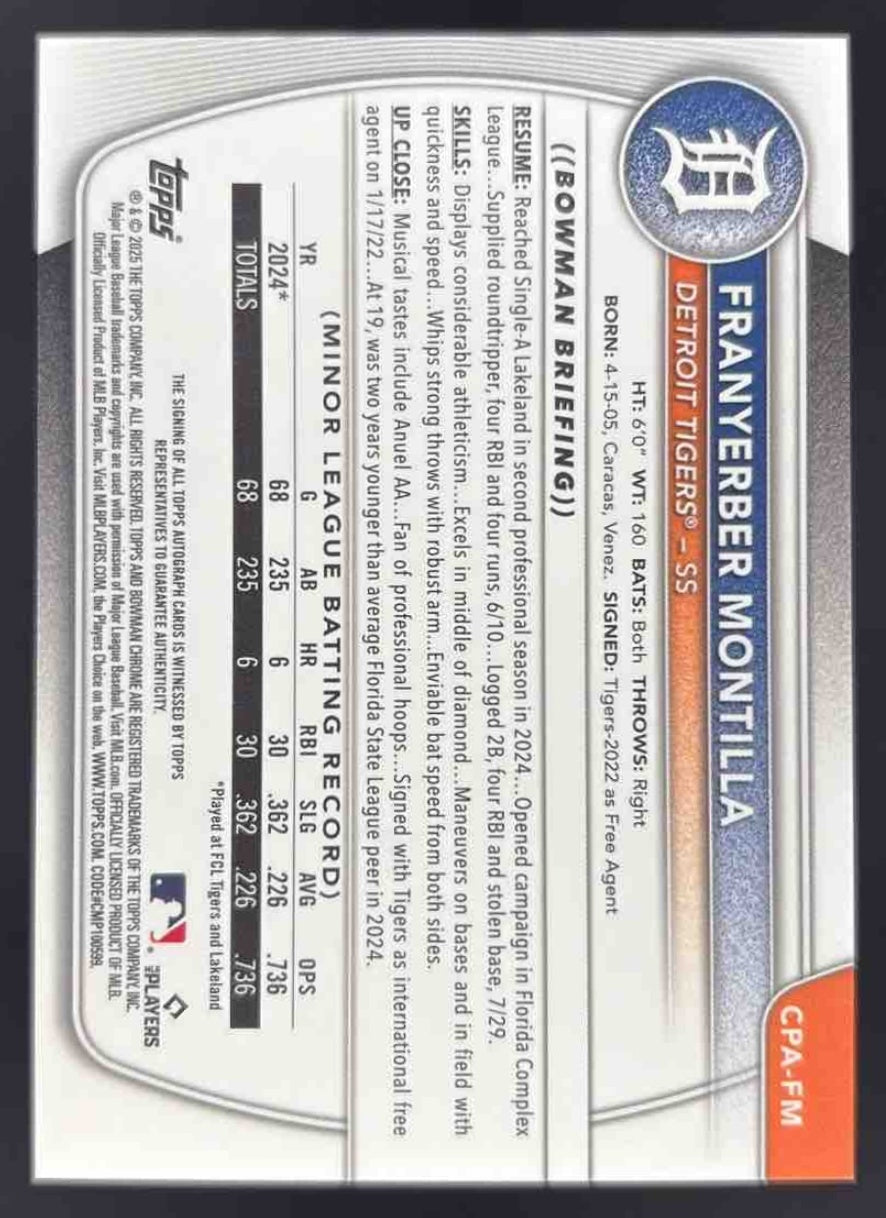 2025 Bowman Chrome Autographs Purple #CPA-FM Franyerber Montilla RC Auto /250