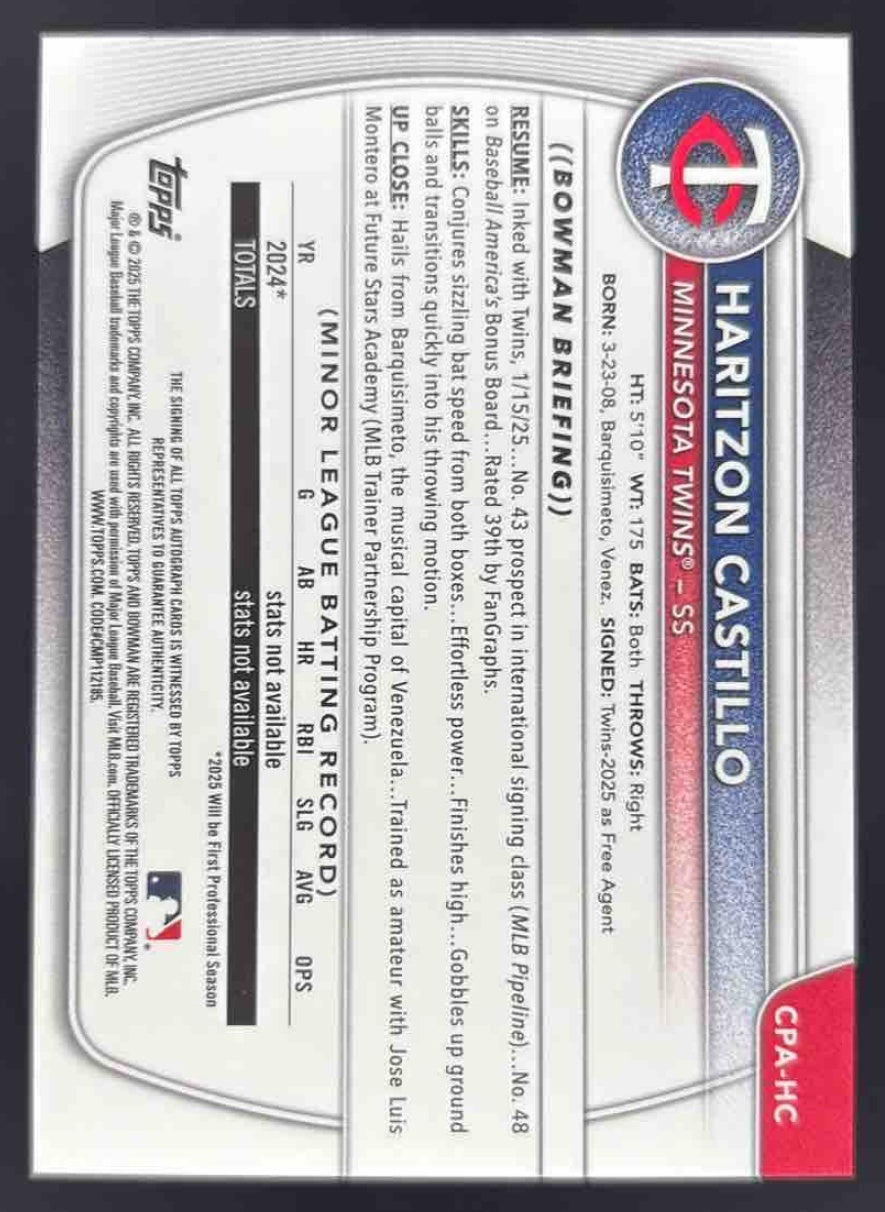 2025 Bowman Chrome Autograph Purple #CPA-HC Haritzon Castillo RC Auto /250