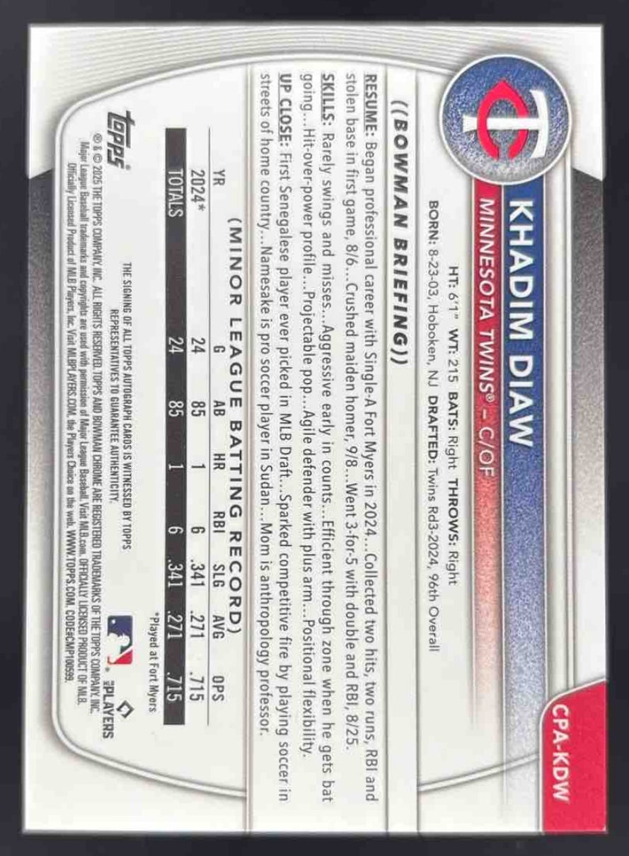2025 Bowman Chrome Autographs Purple Refractor #CPA-KDW Khadim Diaw RC Auto /250