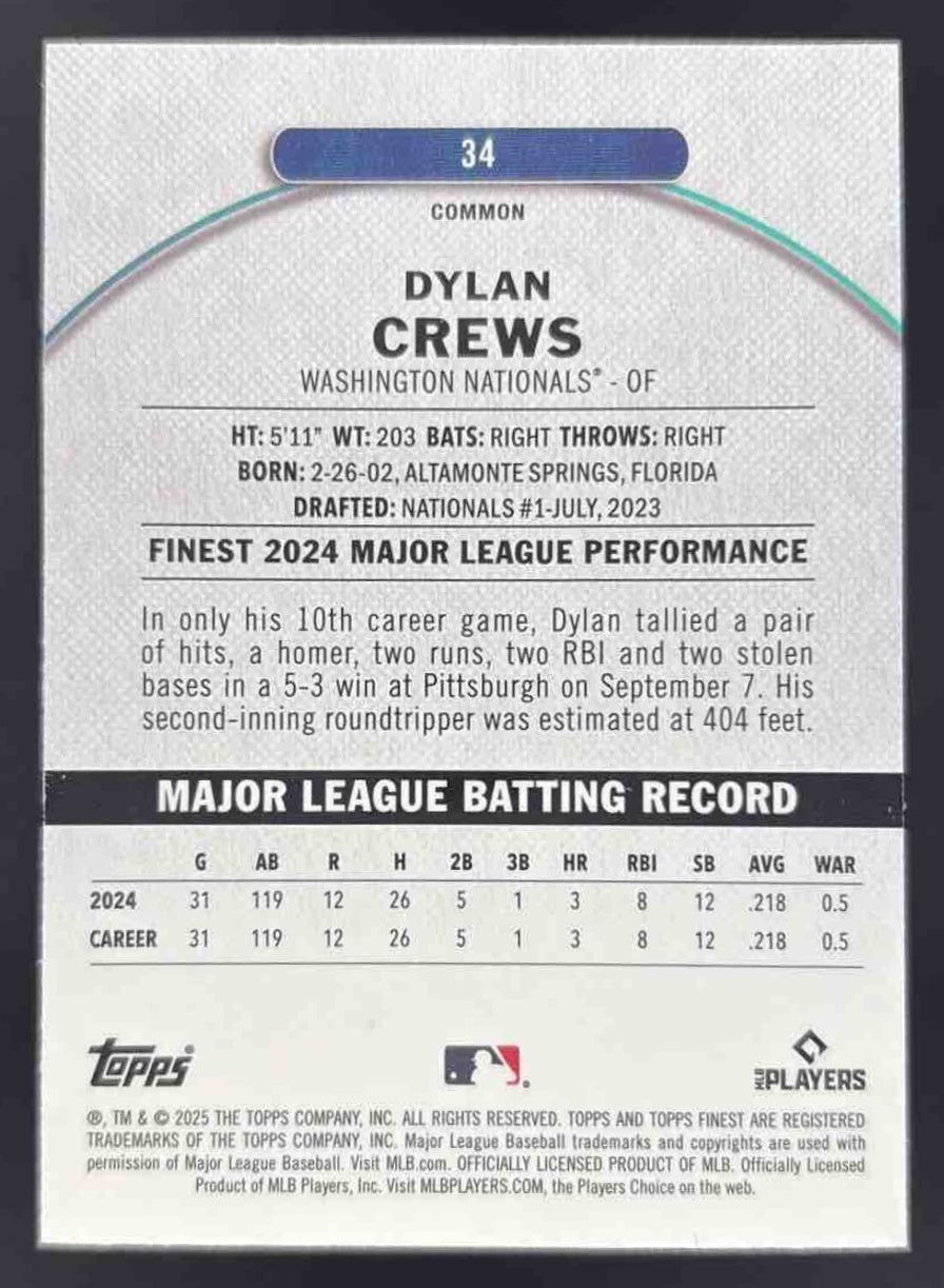 2025 Topps Finest Common Blue X-Fractor #34 Dylan Crews RC /99