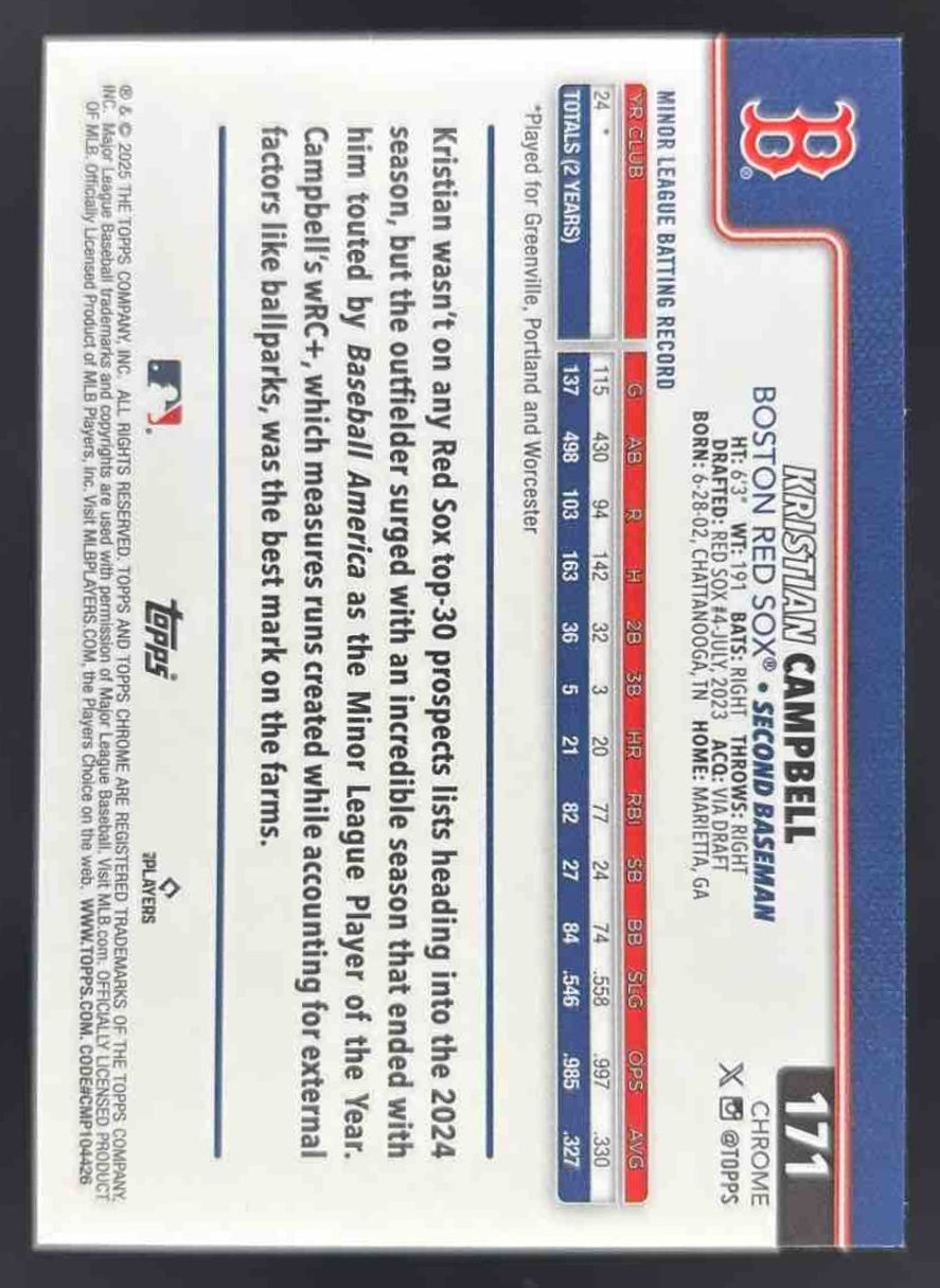 2025 Topps Chrome Purple Refractor #171 Kristian Campbell RC /250