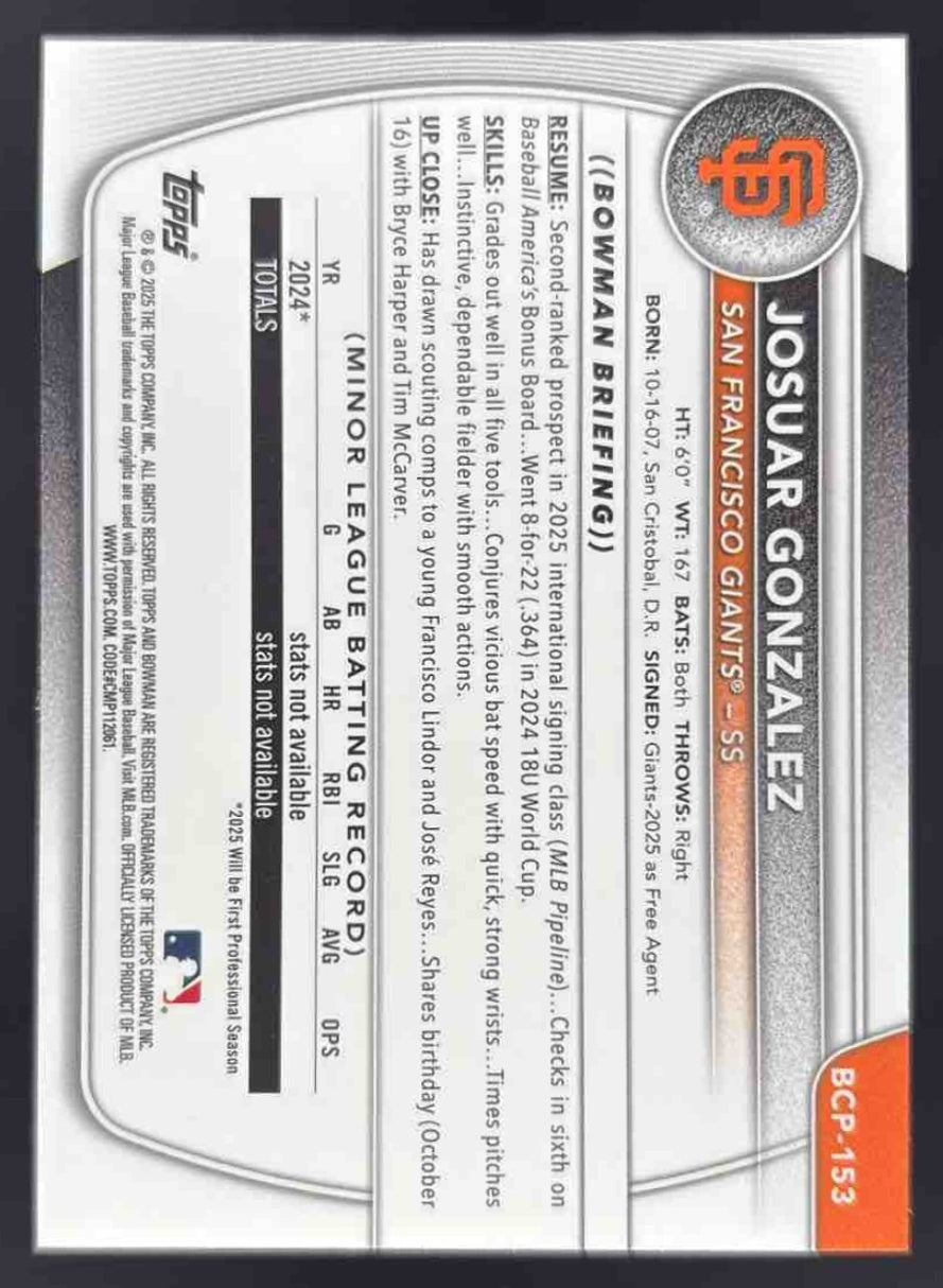 2025 Bowman Chrome Prospects Pulsar Refractor #BCP-153 Josuar Gonzalez RC /399