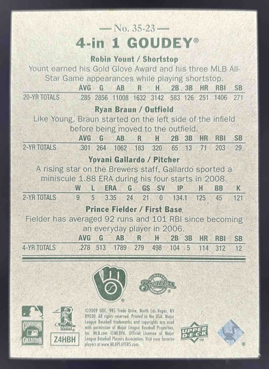 2009 UD Goudey Black Robin Yount Ryan Braun Yovani Gallardo Prince Fielder /21
