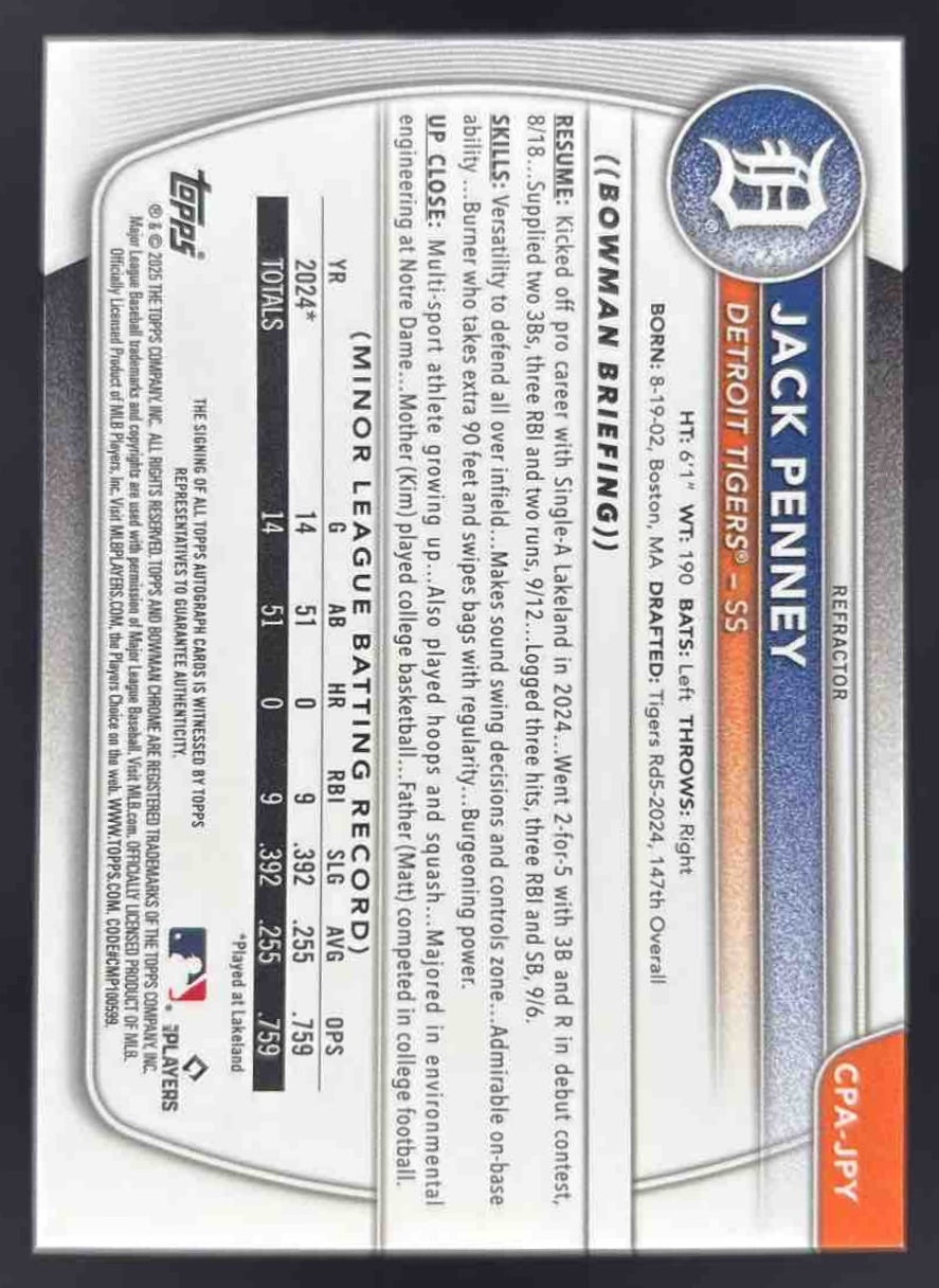 2025 Bowman Chrome Autographs Refractor #CPA-JPY Jack Penney RC Auto /499