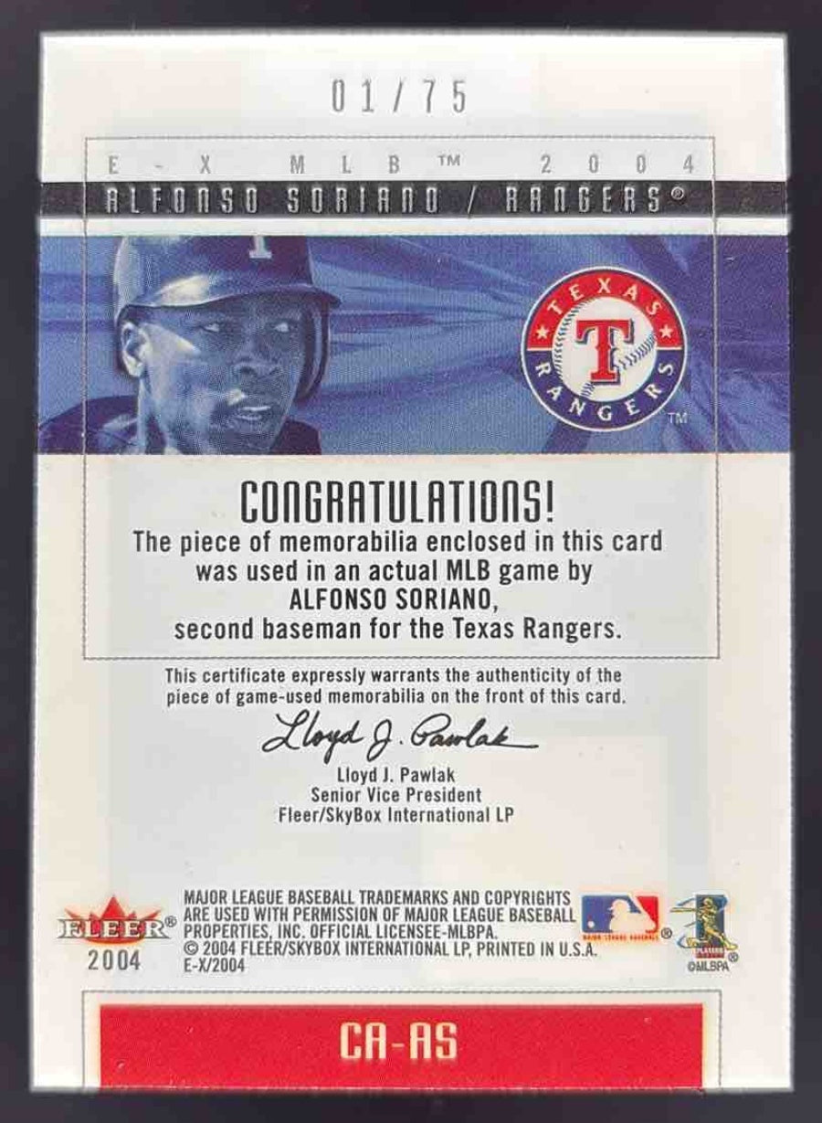 2004 Fleer E-X Clearly Authentics Black Patch #CA-AS Alfonso Soriano /75
