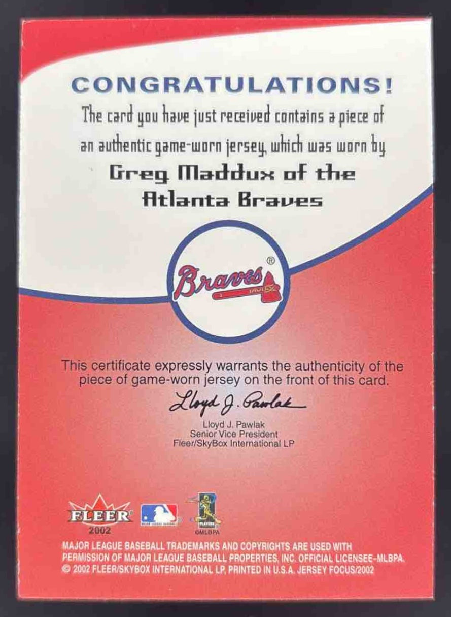 2002 Fleer Focus Jersey Edition K Corps Game Used #NNO Greg Maddux