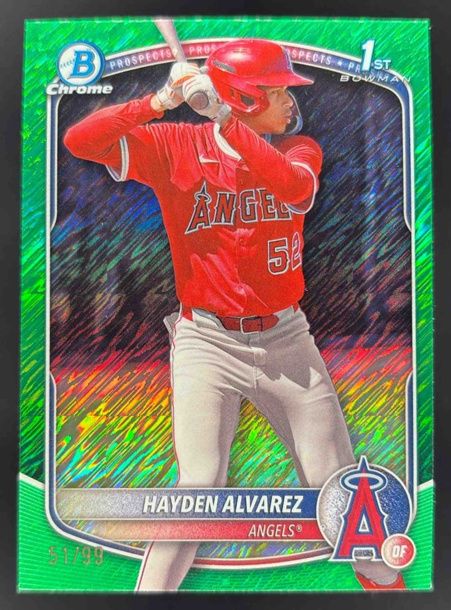 2025 Bowman Chrome Prospects Green Shimmer Refractor #12 Hayden Alvarez RC /99