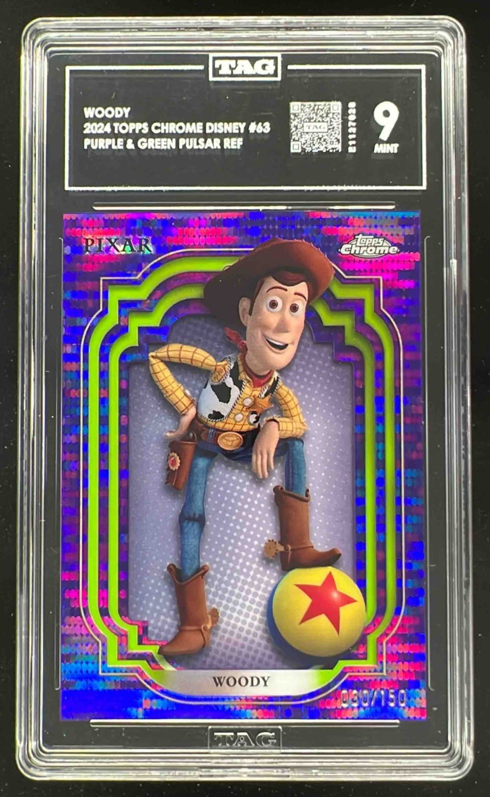 2024 Topps Chrome Disney Purple and Green Pulsar #63 Woody /150 TAG 9