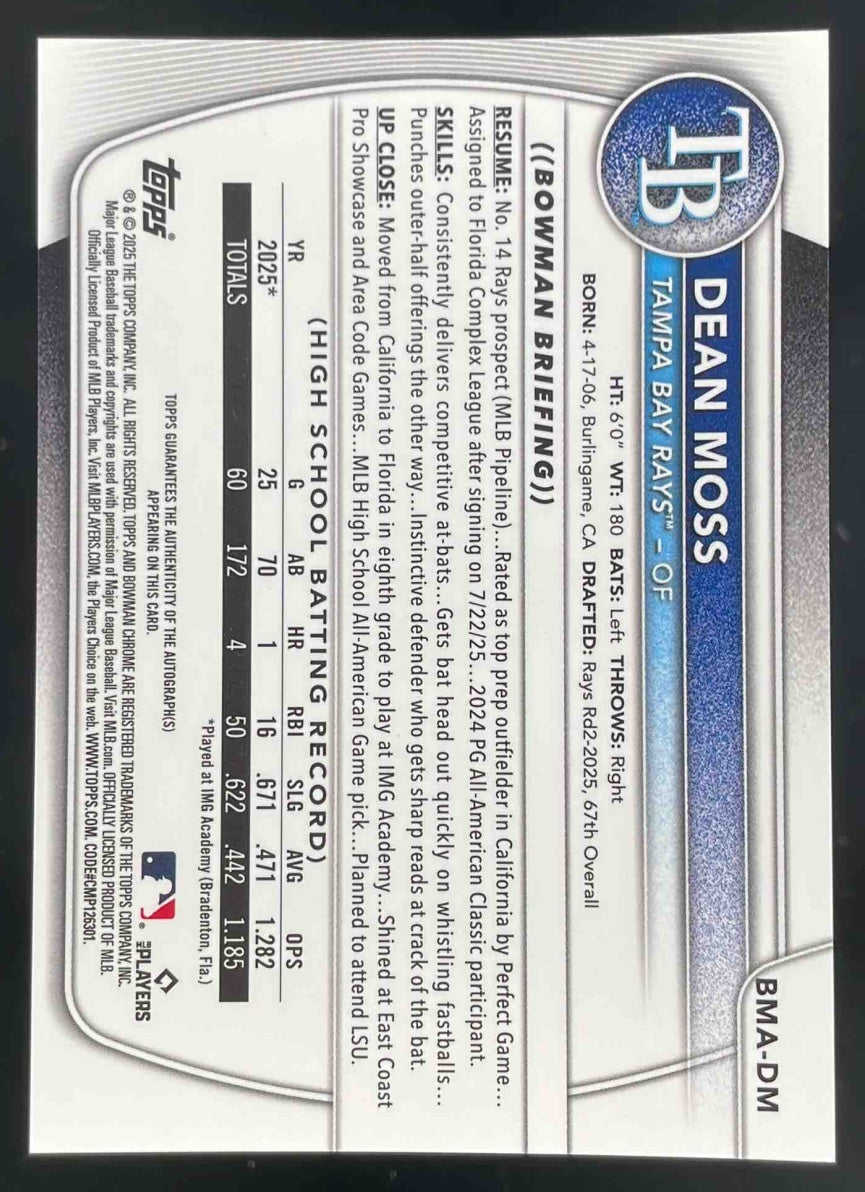 2025 Bowman Chrome Draft Mega Box Prospect Autographs #BMADM Dean Moss Auto