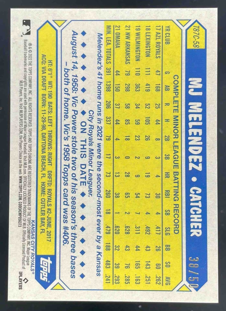2022 Topps Update 1987 Chrome Silver Packs Gold #T87C-58 MJ Melendez RC /50