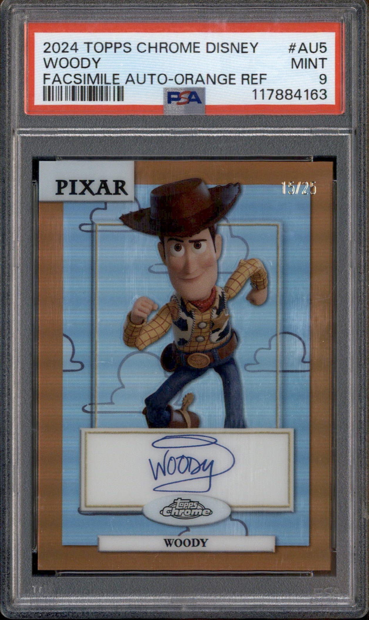 2024 Topps Chrome Disney Facsimile Auto Orange Refractor Woody /25 PSA 9