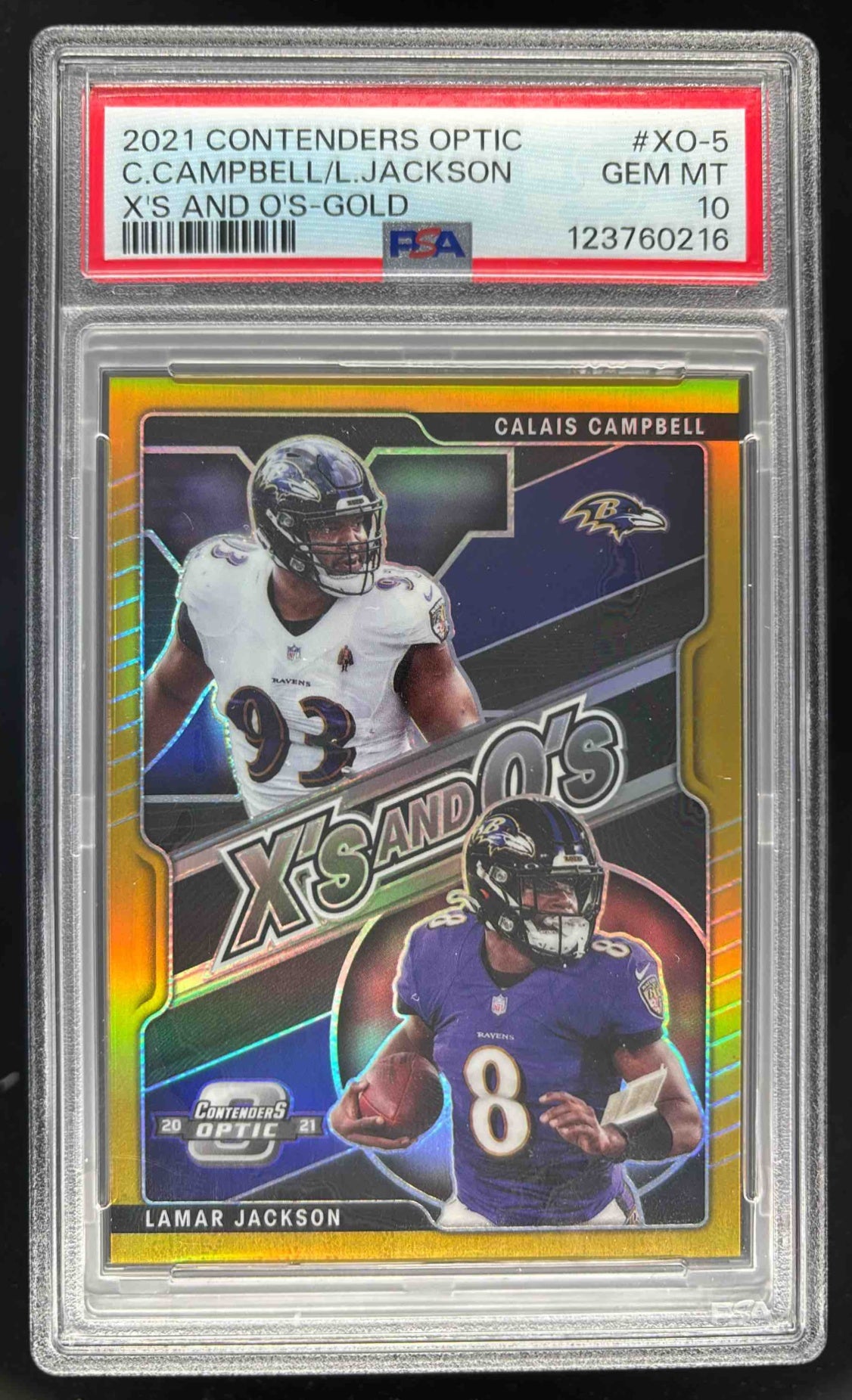 2021 Contenders Optic Xs and Os Gold Calais Campbell Lamar Jackson /10 PSA 10