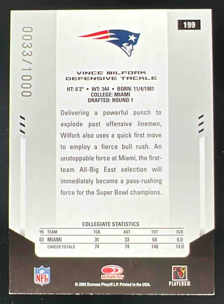 2004 Leaf Certified Materials #199 Vince Wilfork RC /1000