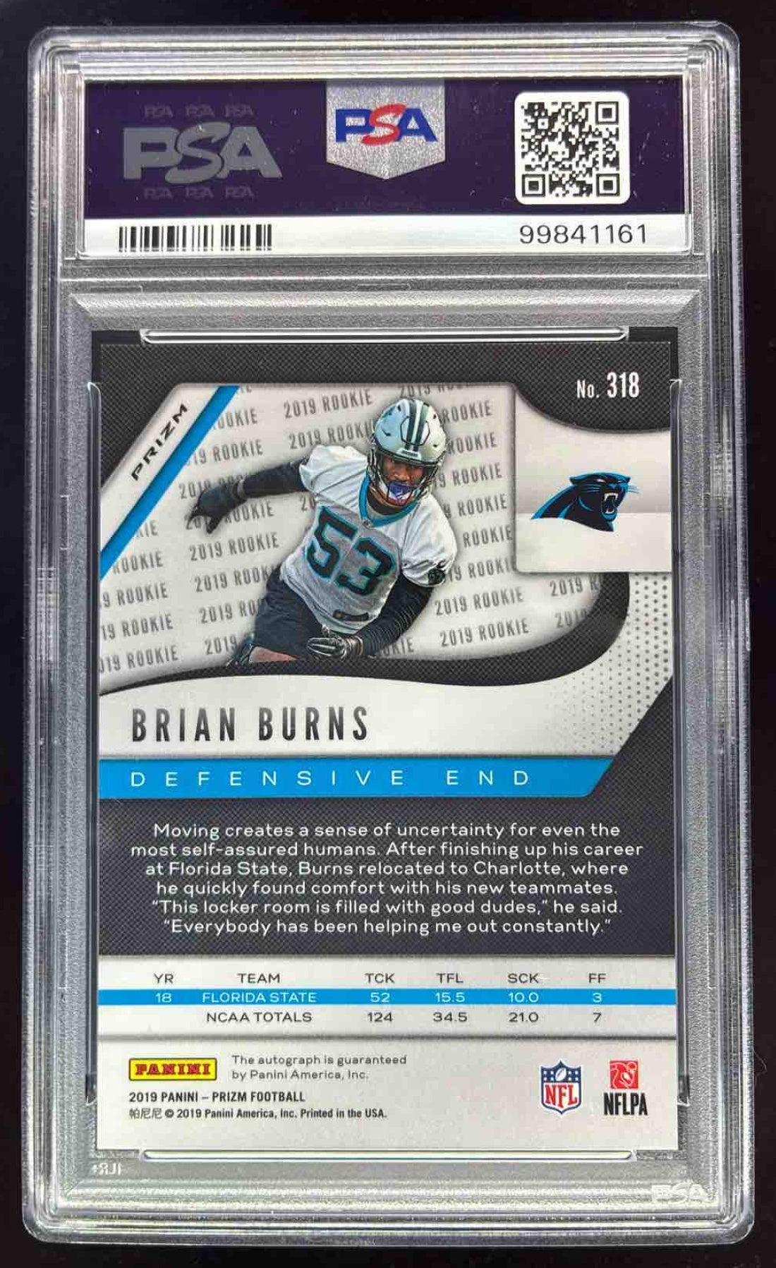 2019 Panini Prizm Rookie Autographs #318 Brian Burns RC Auto PSA 10