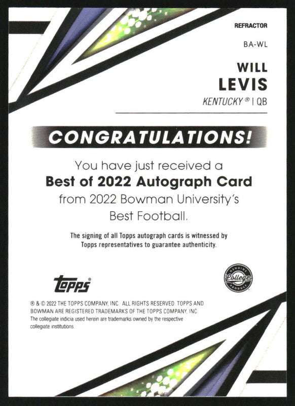 2022 Bowman's Best University Best of '22 Autographs Refractors Will Levis Auto