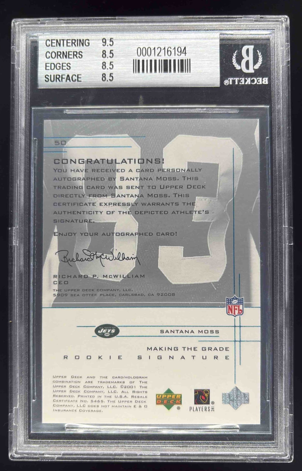 2001 Upper Deck UD Graded Rookie Autographs #50 Santana Moss Auto /500 BGS 8.5