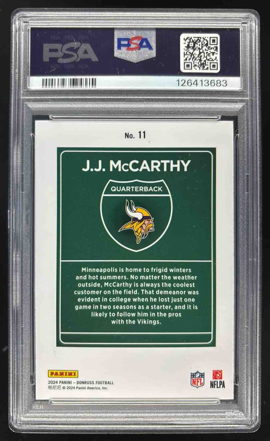 2024 Panini Donruss Downtown! SSP #11 J.J. McCarthy RC PSA 8