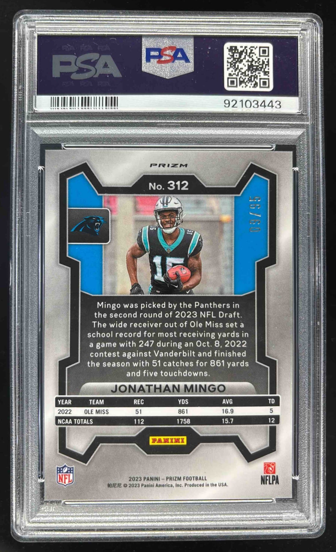 2023 Panini Prizm No Huddle Blue Prizm #312 Jonathan Mingo RC /95 PSA 10