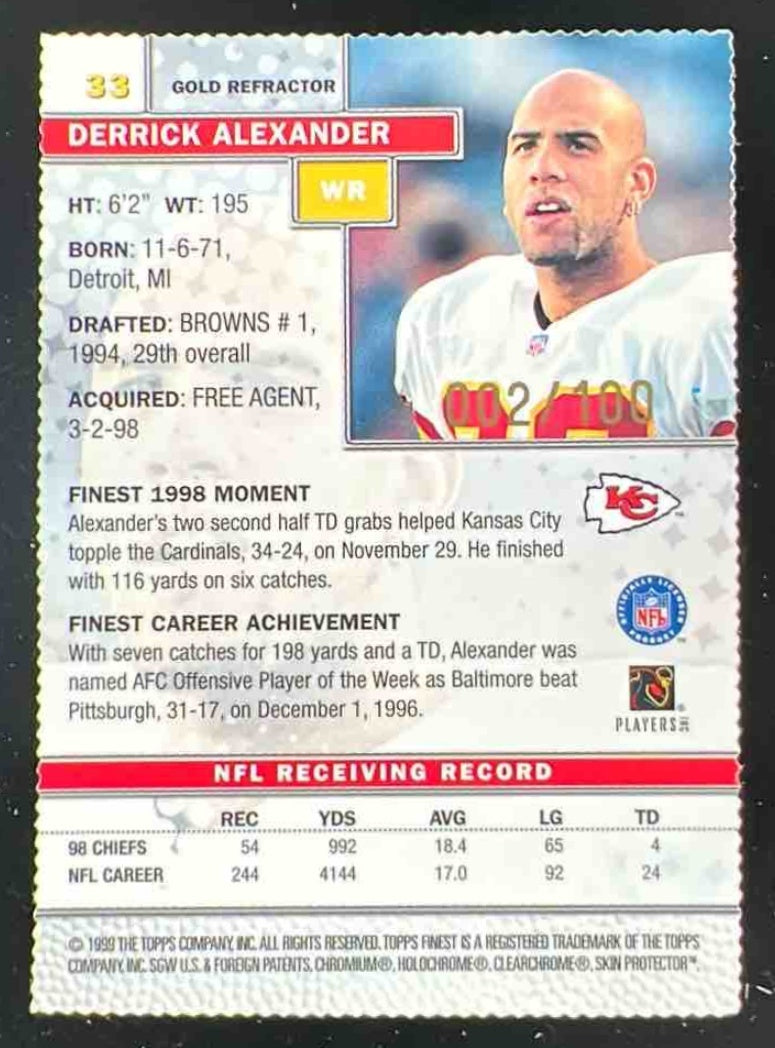 1999 Topps Finest Gold Refractors #33 Derrick Alexander /100