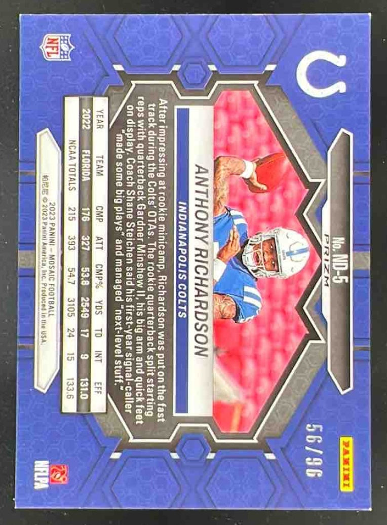 2023 Panini Mosaic Blue Sparkle Prizm #ND-5 Anthony Richardson RC NFL Debut /96