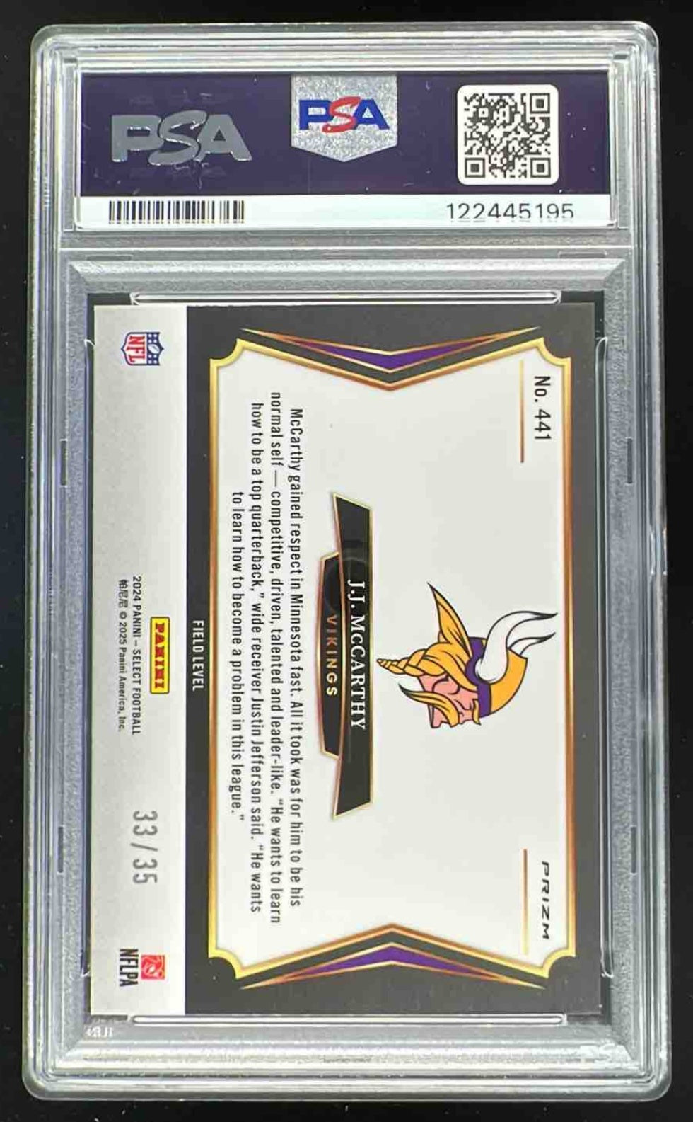 2024 Panini Select Field White Prizm #441 J.J. McCarthy RC /35 PSA 8